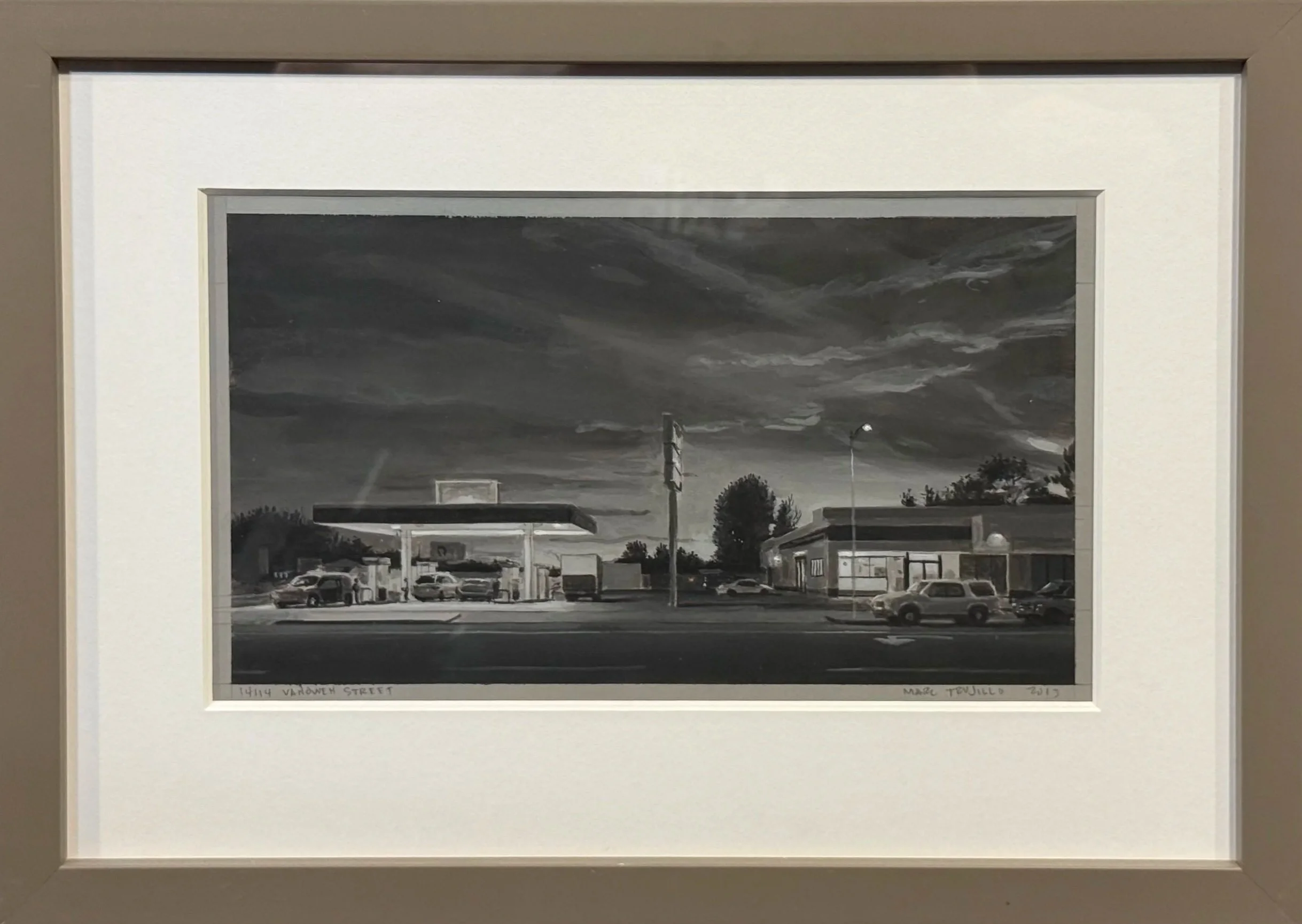 Marc primarily paints the purgatory of American urban and suburban landscapes such as gas stations, shopping malls, big chain stores, and restaurants, the figure plays a vital role in his work, and the paintings are constructed so that the viewer is the primary figure.