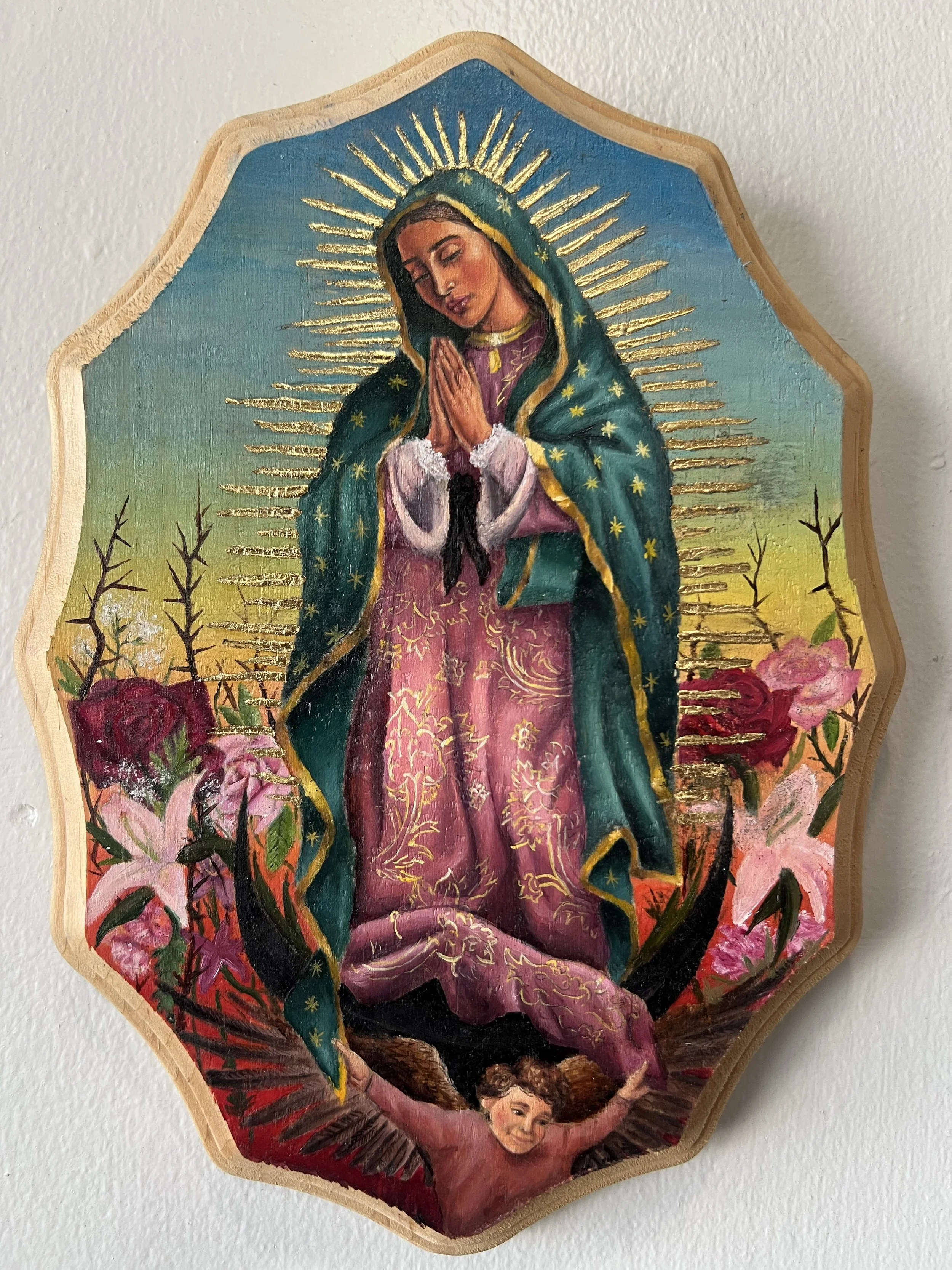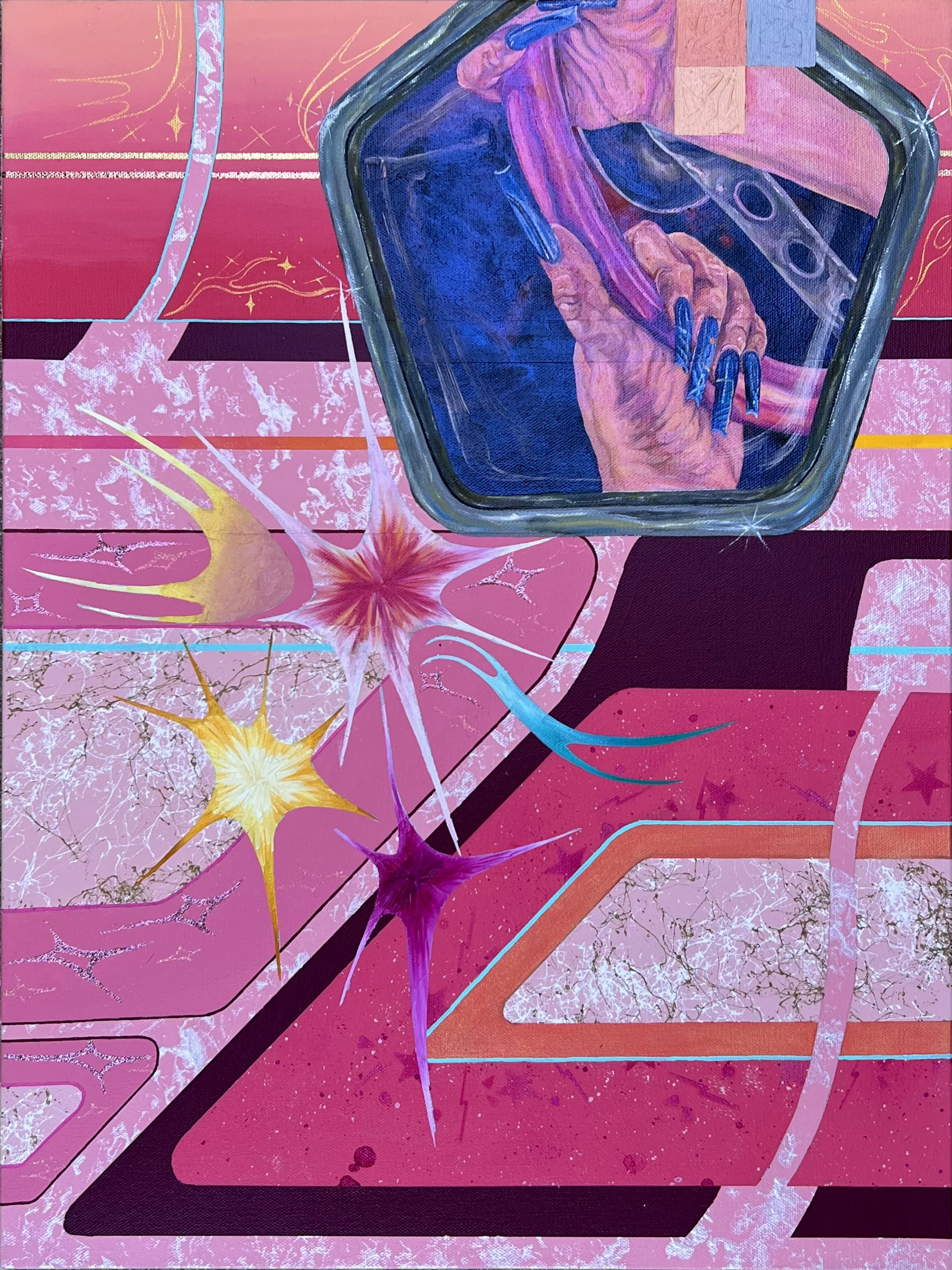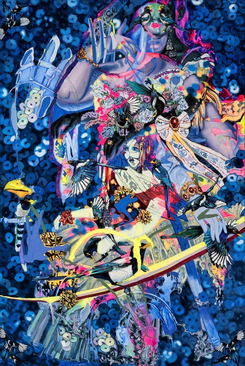 Airbrush, acrylic, aerosol, glitter, gold leaf, and oil on canvas