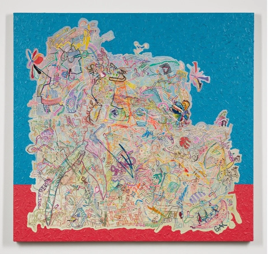 Acrylic, ink, and colored pencil on canvas