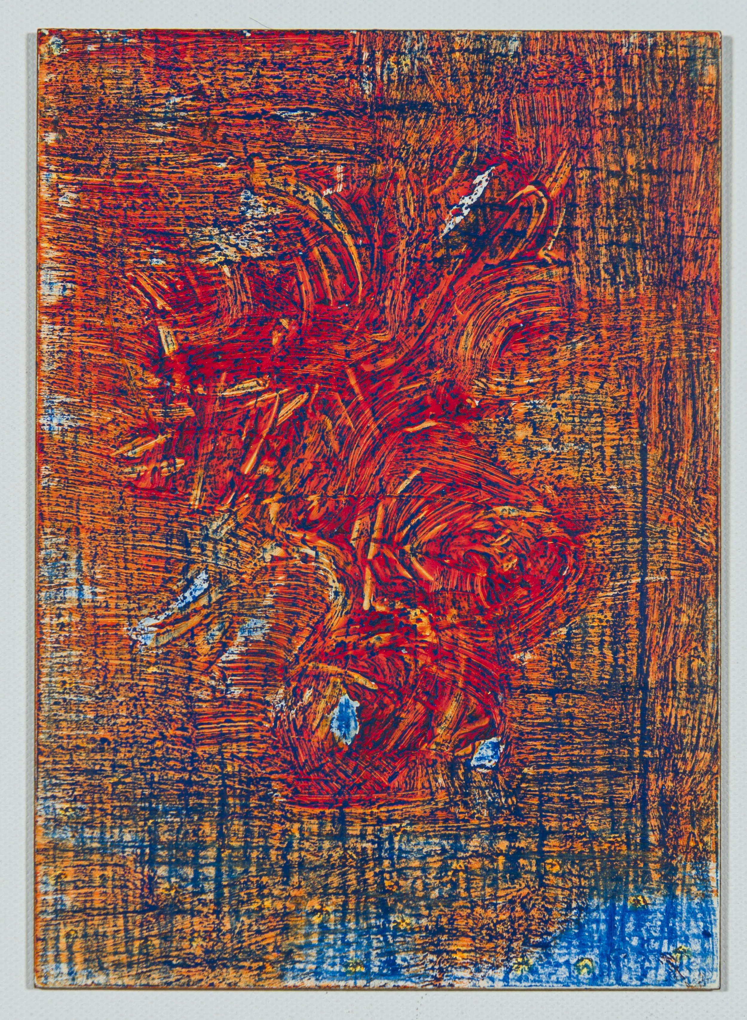Enamel, acrylic, oil, ink, carbon, bandaid, and laminated paper on wood panels