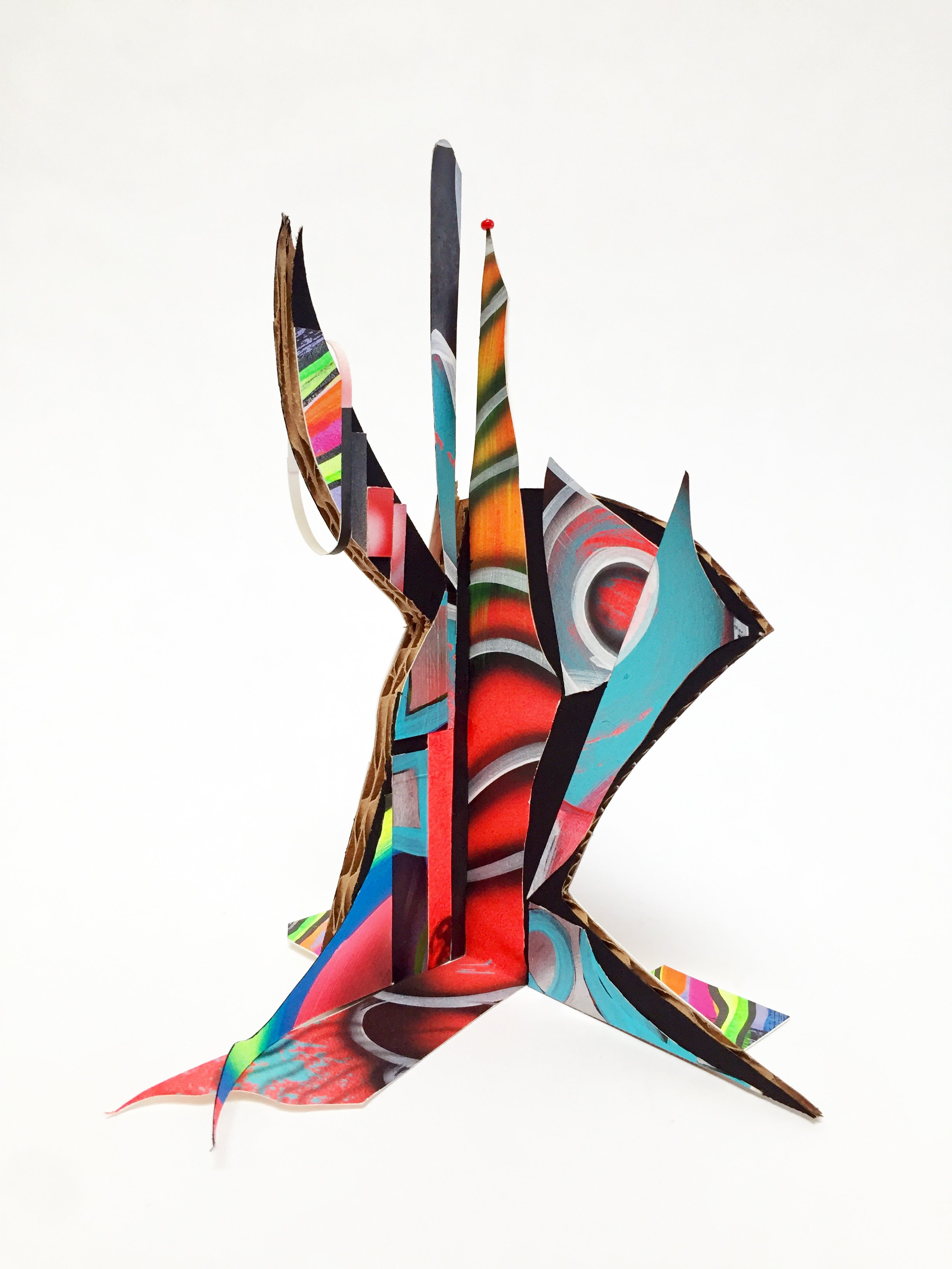 Cardboard, acrylic paint, markers, and oil pastels on paper